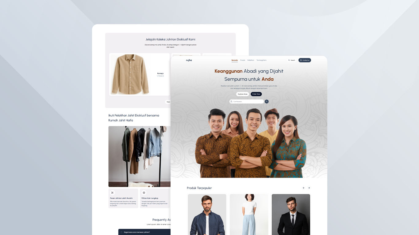 Rujha adalah website pemesanan jahitan yang mempermudah interaksi antara admin dan pelanggan. Admin dapat mengelola data, pembayaran, dan progres jahitan secara rapi, sementara pelanggan bisa memantau status pesanan secara real-time, melihat katalog produk, hingga mendaftar pelatihan. Dengan tampilan sederhana dan fitur komunikasi langsung melalui WhatsApp, Rujha menghadirkan pengalaman pemesanan jahitan yang lebih praktis, transparan, dan profesional.