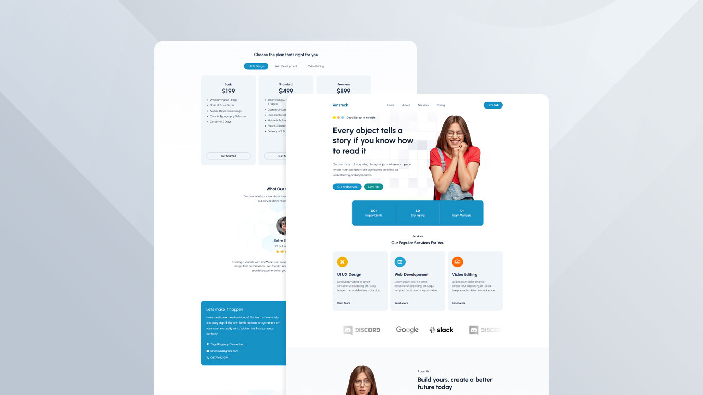 Kinztech adalah website landing page agensi kreatif yang menawarkan layanan UI/UX Design, pengembangan website, dan video editing. Website ini dirancang untuk memperkenalkan layanan secara singkat, membangun kepercayaan calon klien, dan mendorong pengunjung untuk langsung melakukan kontak atau konsultasi.